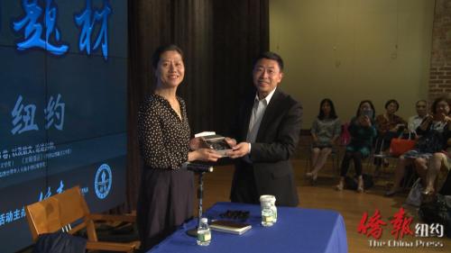 《侨报》总裁游江向王安忆赠送纪念品。