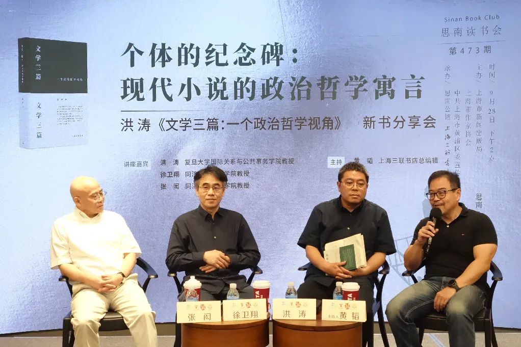 9月28日下午,复旦大学国际关系与公共事务学院教授洪涛携新书《文学三篇:一个政治哲学视角》与同济大学人文学院教授徐卫翔、同济大学人文学院教授张闳、上海三联书店总编辑黄韬一起做客思南读书会第473期,从文学、政治学、哲学三方面入手,探讨小说形式对现代社会个体探索的巨大意义。