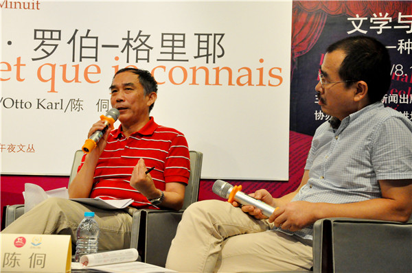 文学对谈:我所认识的阿兰·罗伯-格里耶 于8月17日上午10点在思南公馆· 文学之家举行,法国哲学家、多媒体作家欧托·卡尔,法国作家、文学研究者伯努瓦·皮特斯,著名的翻译家余中先共同出席活动,出版人陈侗担任该活动的主持人。