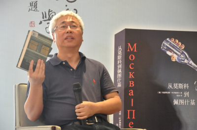 郑体武教授先从知人论世的角度,简单介绍了叶罗费耶夫生平及其作品《从莫斯科到佩图什基》。他还拿来本世纪初俄罗斯出版的一本《从莫斯科到佩图什基》的注释版,“原文仅105页,而注释篇幅竟长达400多页。”他解释道,全书看似醉酒的语言中,尽是典故、隐射,涉及到的俄国各时期作家就有五十个左右,更有俗语、黑话,甚至还有脏话,中文版引进时已经做了相应的处理。