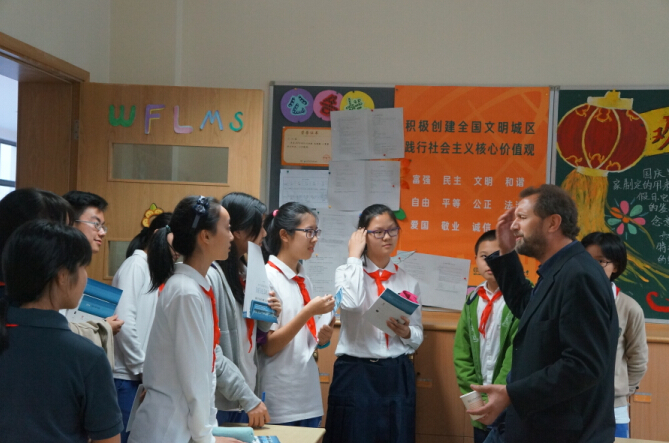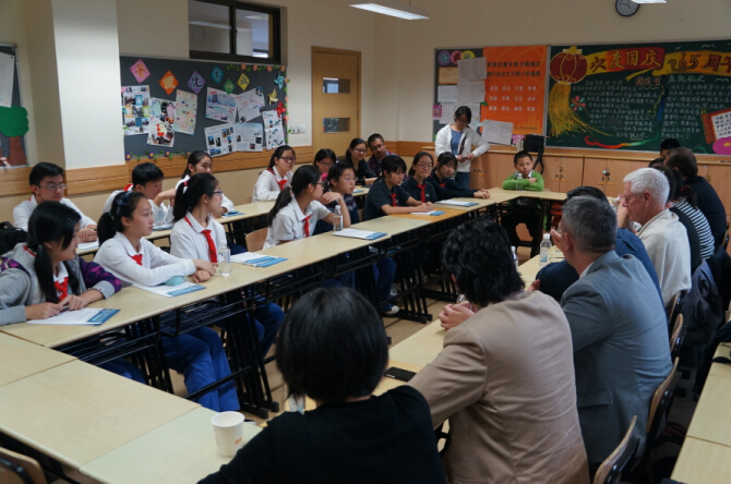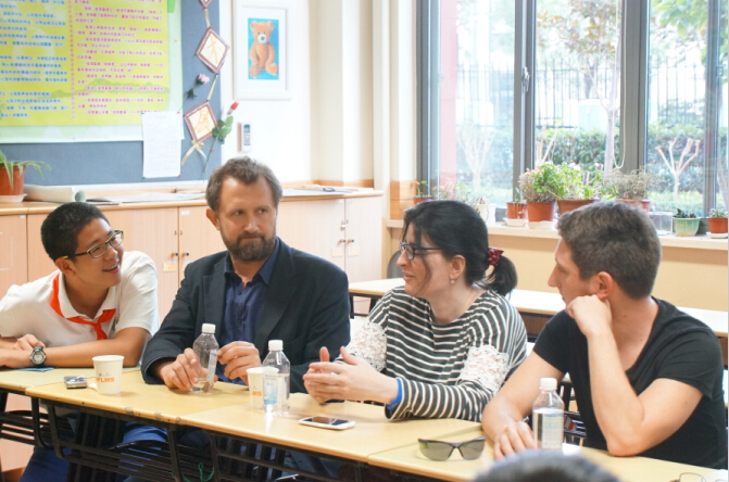在六年级的教室里,作家和同学们围坐一圈,讨论了一些同学们关心的问题:“人与死亡”、“英语与写作”、“文学与翻译”。阿根廷作家维多利亚对同学们小小年龄却对哲学问题进行思考表示非常钦佩,擅长精神和心理分析的青年匈牙利小说家彼得也现身说法,并给予同学们更多的鼓励。